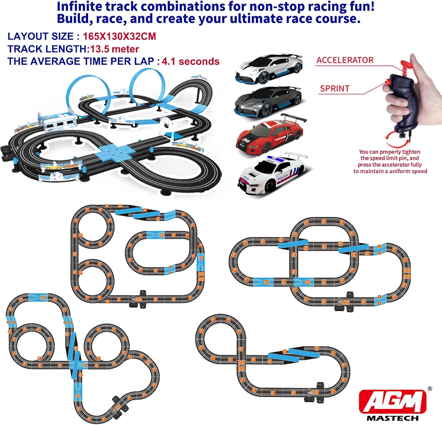 Easy to assemble 13.5m track with loops and multiple layouts for added excitement.