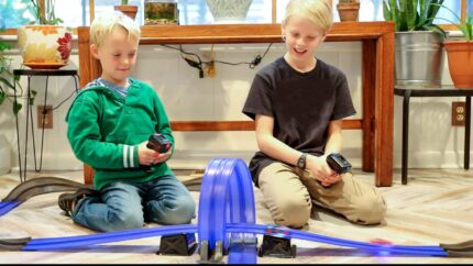 [High-Speed Remote Control Racing Fun] The remote-control racing allows you to enjoy the full force and speed of our race car, which can reach 370 mph on the electrified racetrack. Your children may also experience the fun of racing at home or on the go thanks to our kids race track set’s 2 power modes—electric or 8xAA batteries (not supplied)